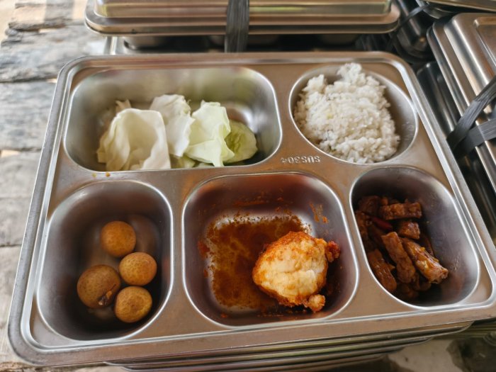 Pada kesempatan kali ini, MBG menyajikan menu berupa:nasi gurih, telur bulat sambal, tumis tempe, lalapan kol dan timun, serta buah kelengkeng. Perpaduan rasa gurih, pedas, segar, dan manis menghadirkan pengalaman makan yang sederhana namun menyehatkan. Menu ini dirancang untuk memberikan energi tambahan sekaligus menjaga keseimbangan gizi siswa.
