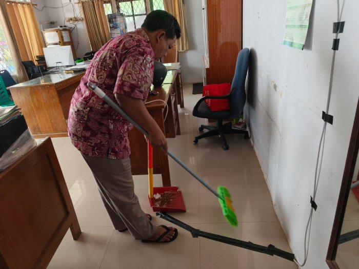 Kota Jambi (MTsN 2) - M. Basid, seorang tenaga kependidikan di MTsN 2 Kota Jambi, menunjukkan kepedulian tinggi terhadap kebersihan lingkungan kerja. Ia turut membersihkan ruang kantor tata usaha, meskipun tugas tersebut bukan merupakan tanggung jawab utamanya. Tindakan sederhana ini bisa menjadi contoh nyata bagi rekan-rekan kerjanya di lingkungan madrasah.